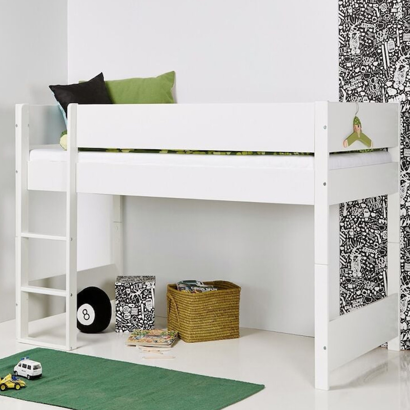 Lasten valkoinen parvisänky, jonka alle mahtuu mukavasti leikkimään. Sängyn alle jäävän tilan voi käyttää hyvin myös lelujen ja muiden tavaroiden säilyttämiseen.